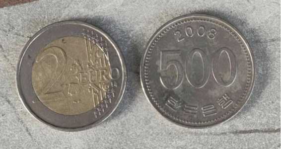 Монета 500 вон (Южная Корея) 2008 года выпуска. Монета 2 евро являющаяся валютой стран Еврозоны.