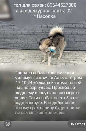 Пропала собака аляскинский маламут , девочка , 1 год, серо- белого окраса. 17 октября утром в 05:00 , г. Находка район дсу